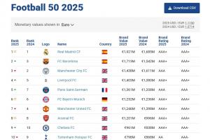 体育资讯08月14日讯 品牌评估机构Brand Finance发布了2025年全球最具价值足球品牌,其中皇马以19.21亿欧蝉联榜首,巴萨17.13亿欧第2,曼城跌至第3,曼联跌至第7。