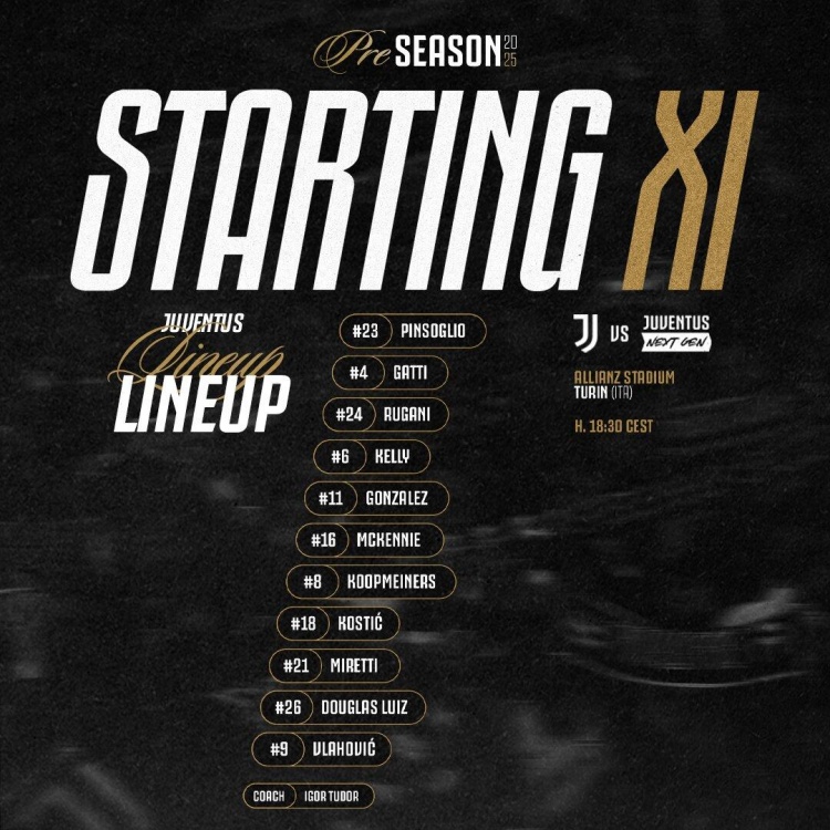 尤文首发:23-平索里奥、4-加蒂、6-凯利、8-库普梅纳斯、9-弗拉霍维奇、11-尼古拉斯-冈萨雷斯、16-麦肯尼、18-科斯蒂奇、21-米雷蒂、24-鲁加尼、26-道格拉斯-路易斯